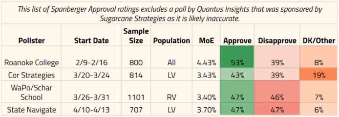 This comes on the heels of a Washington Post-Schar School poll taken at the end of March showing a 47%-46% approval-disapproval rating, making Spanberger the most unpopular governor at two months into office in modern Virginia’s history.