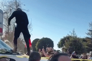 Video shows anti-Iranian regime protesters swarming U-Haul that drove through Los Angeles demonstration, smashing windshield before police detain driver.
